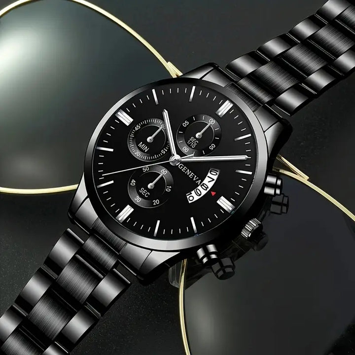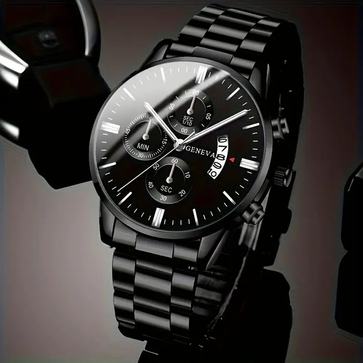 Men'S Business Round Quartz Watch, Fashion Design with Calendar Display, Pointer Type, Black Stainless Steel Strap, Electronic Movement